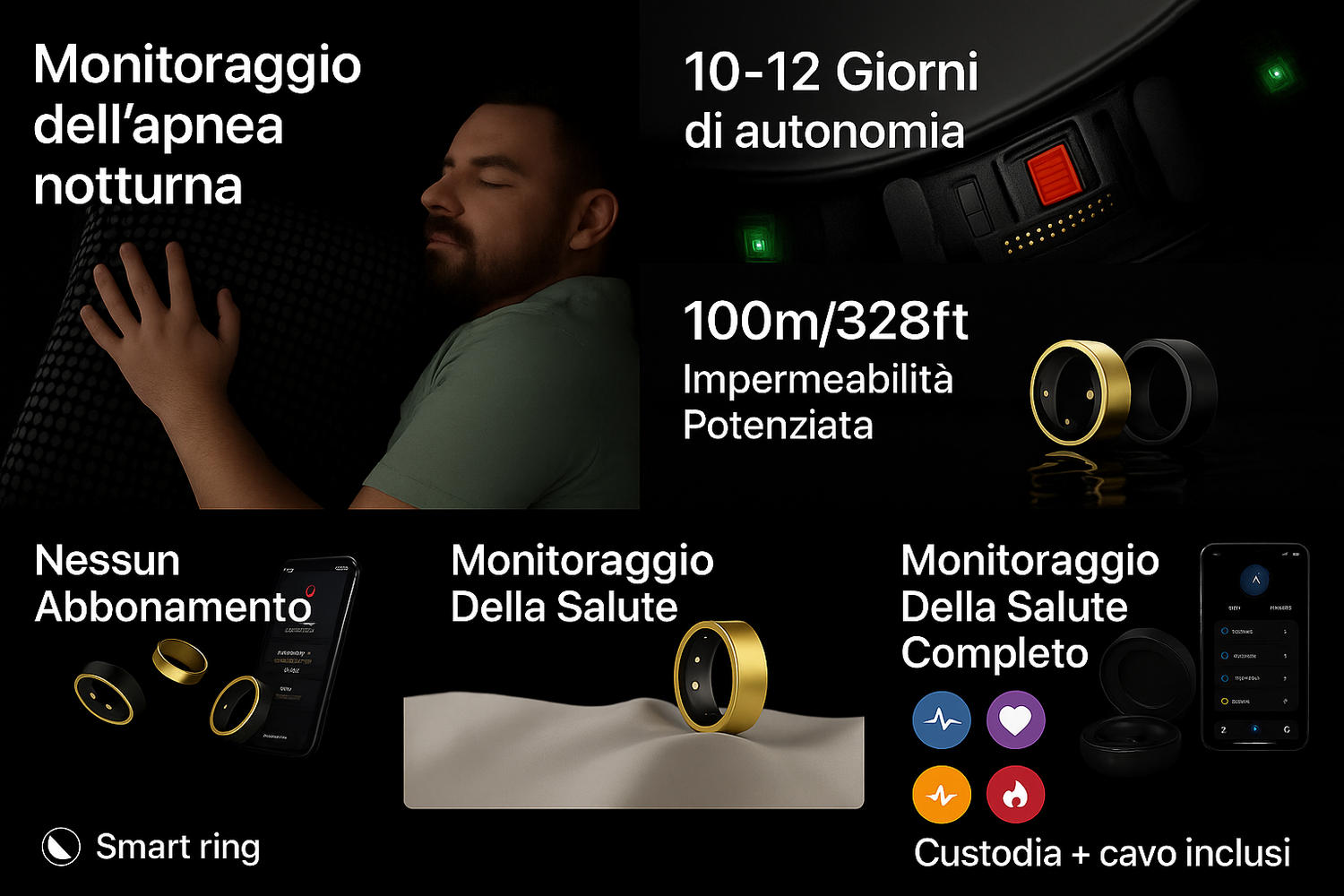 SmartRing™ monitora continuamente il tuo battito cardiaco (HR), la variabilità della frequenza cardiaca (HRV) e l’ossigenazione del sangue (SpO₂), 24 ore su 24.