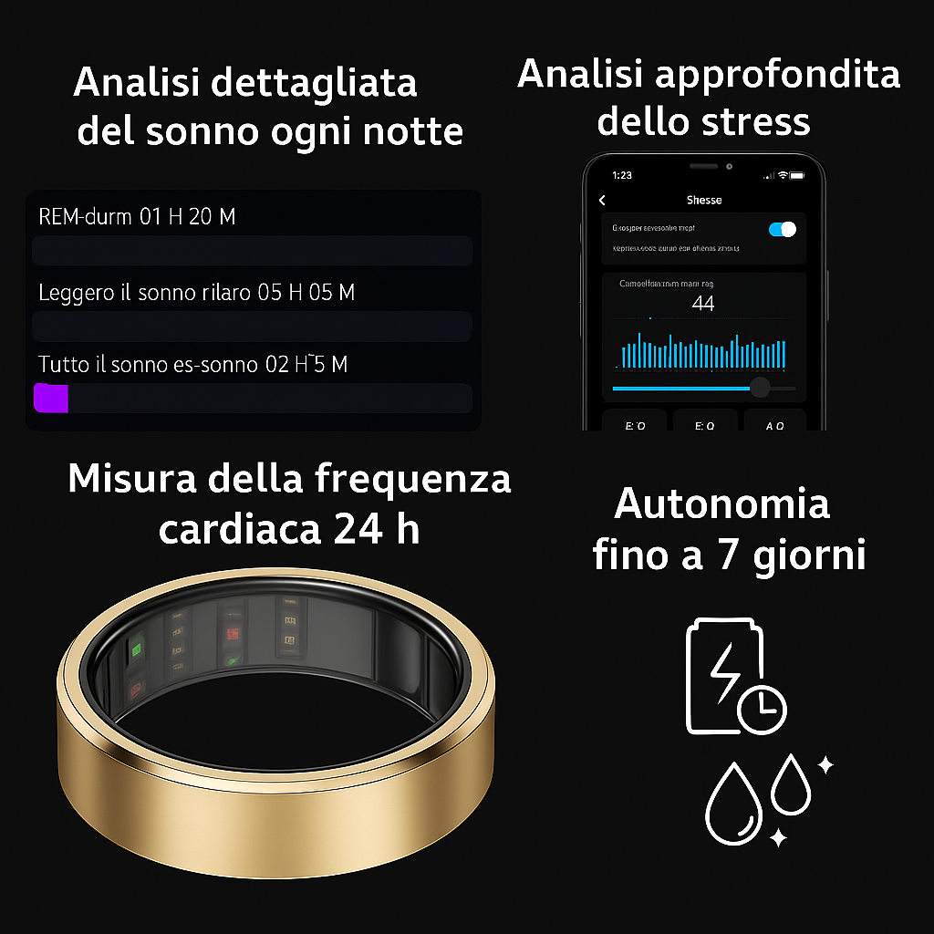 L’anello Simplizia utilizza sensori ottici avanzati per analizzare in tempo reale diversi dati relativi alla tua salute: frequenza cardiaca, sonno, livello di stress, attività fisica, temperatura corporea, ecc.